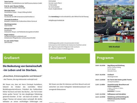 Liebe Angehörige, liebe Zugehörige, während eines gemeinsamen Spaziergangs Kraft schöpfen, sich austauschen oder einfach kurz durchatmen, dazu möchten wir Sie herzlich einladen. Unser Angebot richtet sich an Alle, die einen nahestehenden Menschen während einer schweren Krankheit begleiten oder einen lieben Menschen im Hospiz (ambulant / stationär) verloren haben. Wir treffen uns 1x monatlich um 11:00 Uhr an der Haltestelle „Stadtwald“ (Buslinie 58, Höhe Jentgesalle 85). Von dort aus werden wir circa eine Stunde im Stadtwald in Krefeld unterwegs sein. Bei Fragen wenden Sie [...]