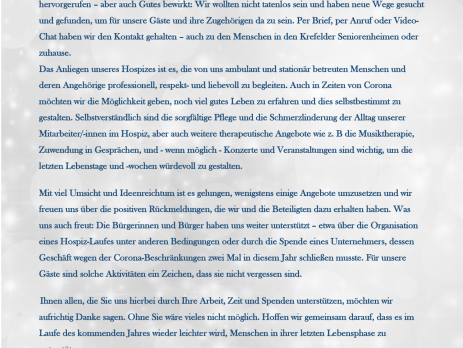 Liebe Freunde und Unterstützer der Hospiz-Arbeit in Krefeld, Pfingsten ist ein Hochfest in der Kirche: Sie feiert das Kommen des Heiligen Geistes, der die Einheit der Gläubigen schuf. Dieses Gefühl der Einheit, des Zusammenhaltens brauchen wir derzeit dringend. Nur wenn wir Wege finden, füreinander da sein, können wir es schaffen, die Folgen der Corona-Pandemie auch seelisch zu bewältigen. Kontakteinschränkungen statt Nähe und Geborgenheit zu geben – diese Situation ist gerade in der letzten Lebensphase eines Menschen schwer zu ertragen. Unser Team [...]