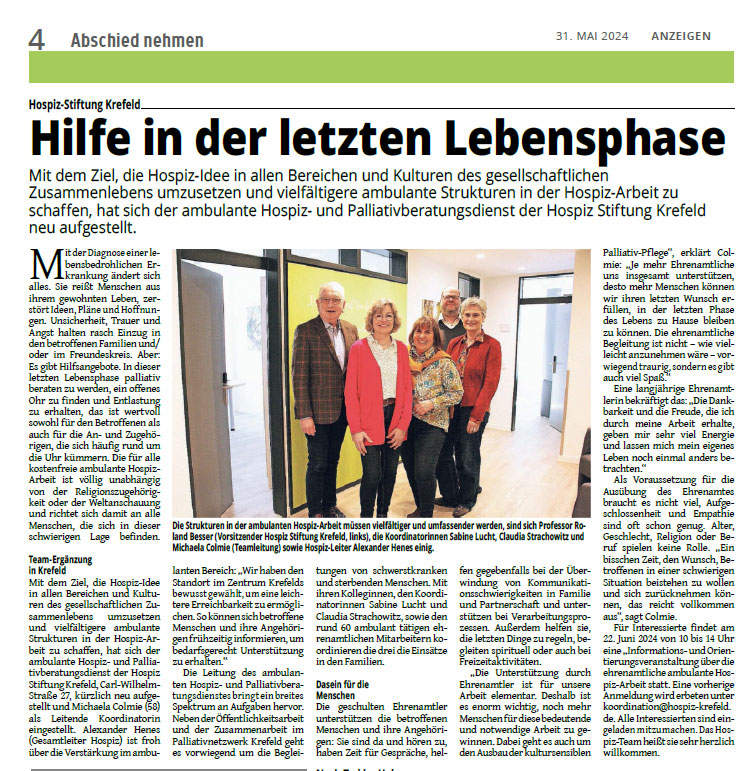 Westdeutsche Zeitung, Sonderveröffentlichung Abschied nehmen, 31. Mai 2024