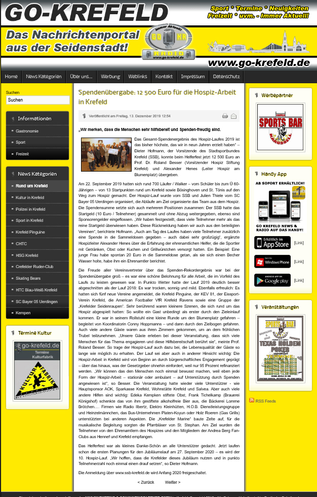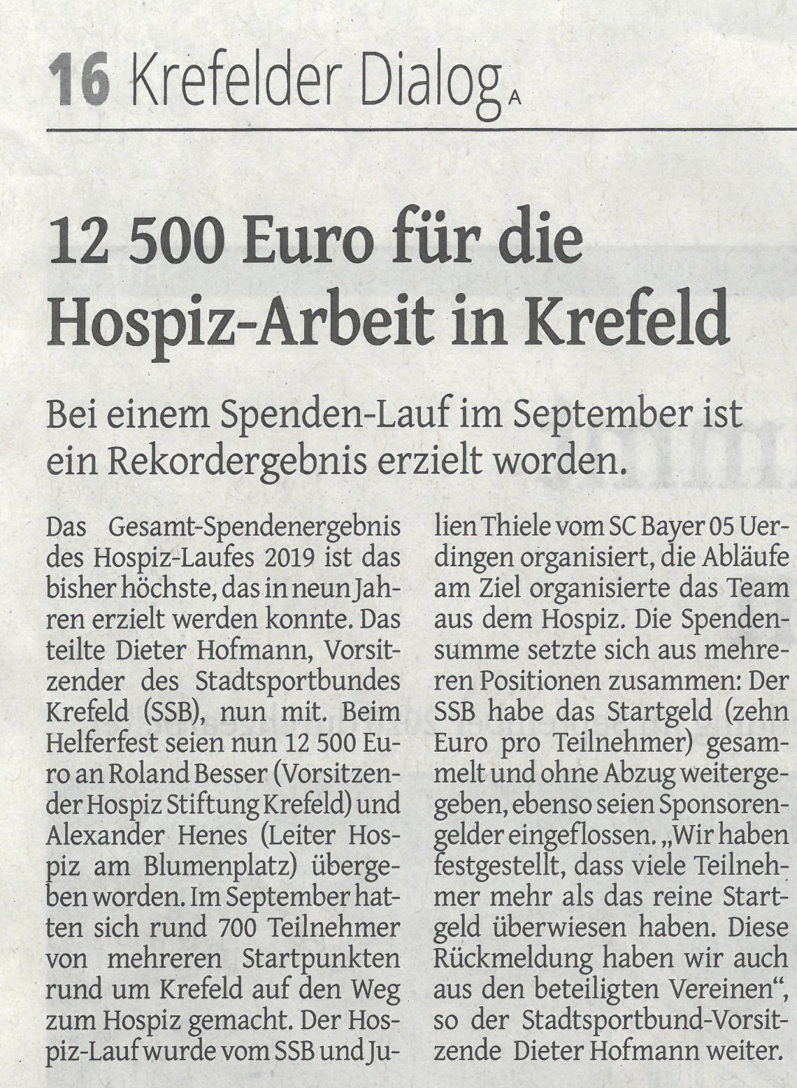 „Wir merken, dass die Menschen sehr hilfsbereit und Spenden-freudig sind. Das Gesamt-Spendenergebnis des Hospiz-Laufes 2019 ist das bisher höchste, das wir in neun Jahren erzielt haben“ – Dieter Hofmann, der Vorsitzende des Stadtsportbundes Krefeld (SSB), konnte beim Helferfest jetzt 12 500 Euro an Prof. Dr. Roland Besser (Vorsitzender Hospiz Stiftung Krefeld) und Alexander Henes (Leiter Hospiz am Blumenplatz) übergeben. Am 22. September 2019 hatten sich rund 700 Läufer / Walker – vom Schüler bis zum Ü 60-Jährigen – von 13 Startpunkten rund um Krefeld sowie Bösinghoven und St. Tönis auf den Weg zum Hospiz gemacht. Der Hospiz-Lauf wurde vom SSB und Julien Thiele vom SC Bayer 05 Uerdingen organisiert, die Abläufe am Ziel organisierte das Team aus dem Hospiz.