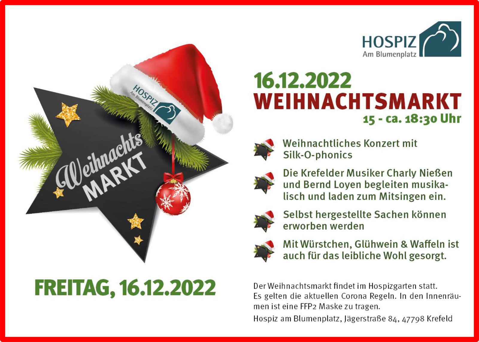 Der Weihnachtsmarkt im Hospiz am Blumenplatz findet statt am 16. Dezember in der Zeit von 15 bis 18.30 Uhr. Die Adresse: Jägerstraße 84, Krefeld.